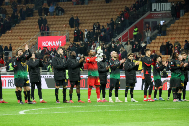 I giocatori del AC Milan, compreso Mike Maignan, salutano i loro tifosi dopo aver vinto la partita di Serie A contro l’Hellas Verona a Milano, Italia, il 15 febbraio 2025. EPA-EFE/ROBERTO BREGANI.
