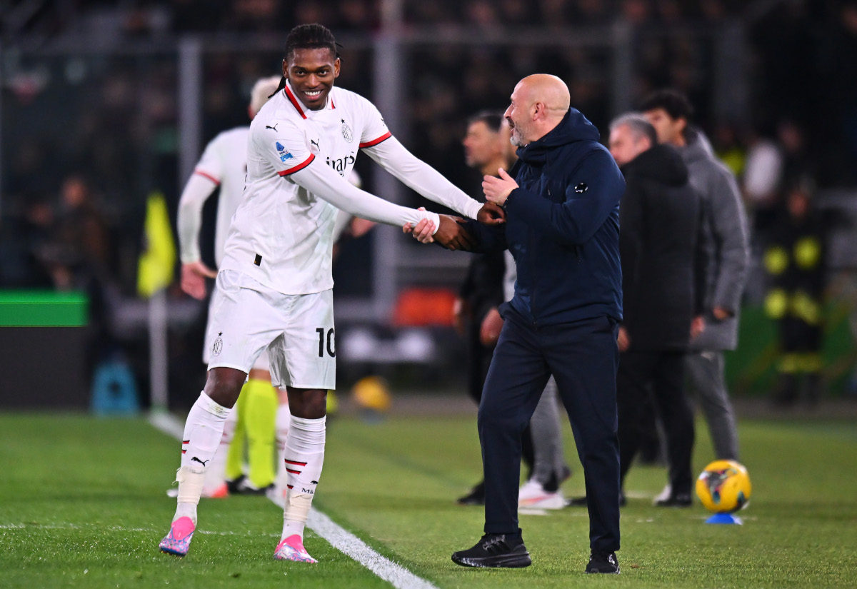 BOLOGNA, ITALIA – 27 FEBBRAIO: Rafael Leao dell’AC Milan e Vincenzo Italiano, allenatore del Bologna, interagiscono durante la partita di Serie A tra Bologna e AC Milan allo Stadio Renato Dall’Ara il 27 febbraio 2025 a Bologna, Italia. (Foto di Alessandro Sabattini/Getty Images)
