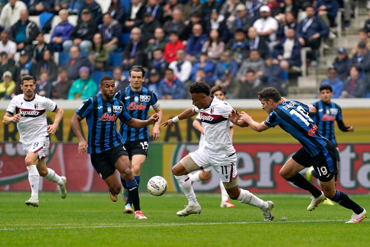 BERGAMO, ITALIA – 13 APRILE: Dan Ndoye del Bologna controlla la palla sotto pressione di Berat Djimsiti dell’Atalanta durante la partita di Serie A tra Atalanta e Bologna al Gewiss Stadium il 13 aprile 2025 a Bergamo, Italia. (Foto di Pier Marco Tacca/Getty Images)