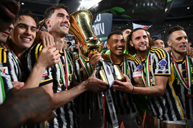 La Juventus ha trionfato nella finale della Coppa Italia contro l’Atalanta, celebrando la vittoria all’Olimpico di Roma il 15 maggio 2024. I protagonisti della serata sono stati Dusan Vlahovic, Danilo e Adrien Rabiot, che hanno posato fieri con il trofeo, simbolo del loro trionfo. (Foto di Isabella BONOTTO / AFP via Getty Images)